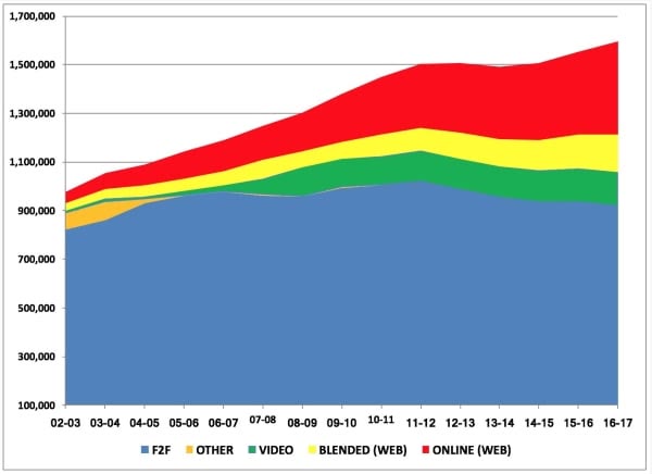 The UCF chart confirms the quite surprising existence of a quiet revolution in virtual instruction in which blended is penetrating the often hermetic walls of conventional classrooms. As online learning observer Michael Horn notes in [Forbes](https://www.forbes.com/sites/michaelhorn/2015/04/23/report-that-says-online-learning-growth-is-slowing-misses-big-picture/#769fdc18296a), “Blended delivery of online learning doesn’t count toward the data.”